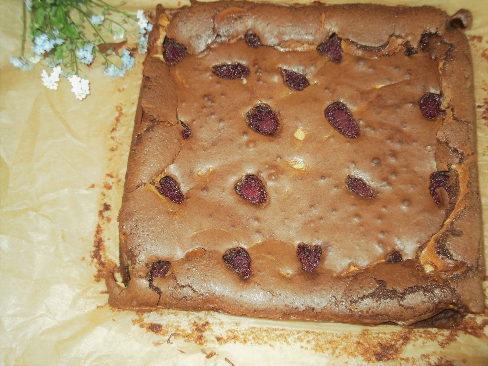 - Na wierzch wykładamy resztę masy brownie - ja wylałam ją prosto z miski, ale można również stworzyć kleksy za pomocą łyżki.